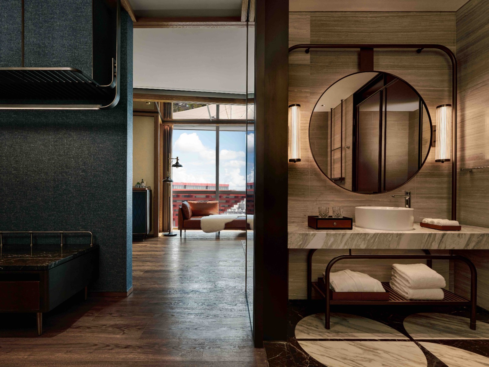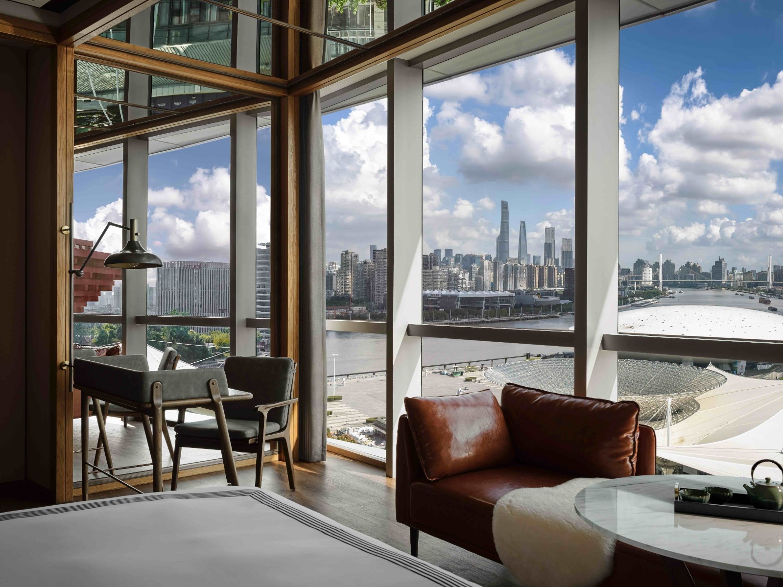 254间客房与套房延续品牌标志性的现代工业风格与居家风尚。落地窗引入江景与城市天际线,木制地板搭配手工地毯、金属细节与温暖色调的定制家具,以展馆艺术为灵感的装饰点缀其间。