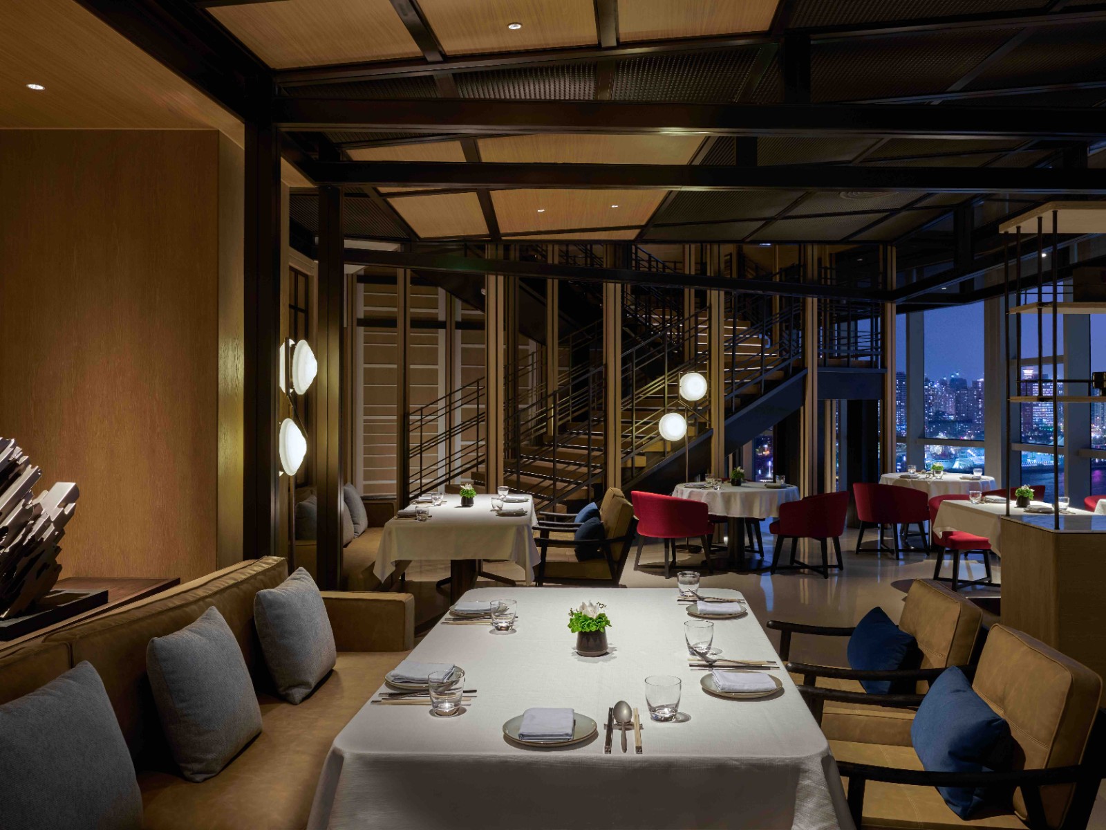 室内设计由新加坡银狐设计工作室(SilverFox Studios)操刀,灵感源自中国2010年上海世界博览会展馆,打造出馆中馆的空间叙事。简洁的钢结构致敬场地的工业记忆,在光影与材质的层叠中呈现桐森式的对比美学——钢与木、混凝土与天鹅绒、复古与当代相映成趣,营造出兼具沉稳与精致、先锋与经典的感官体验。